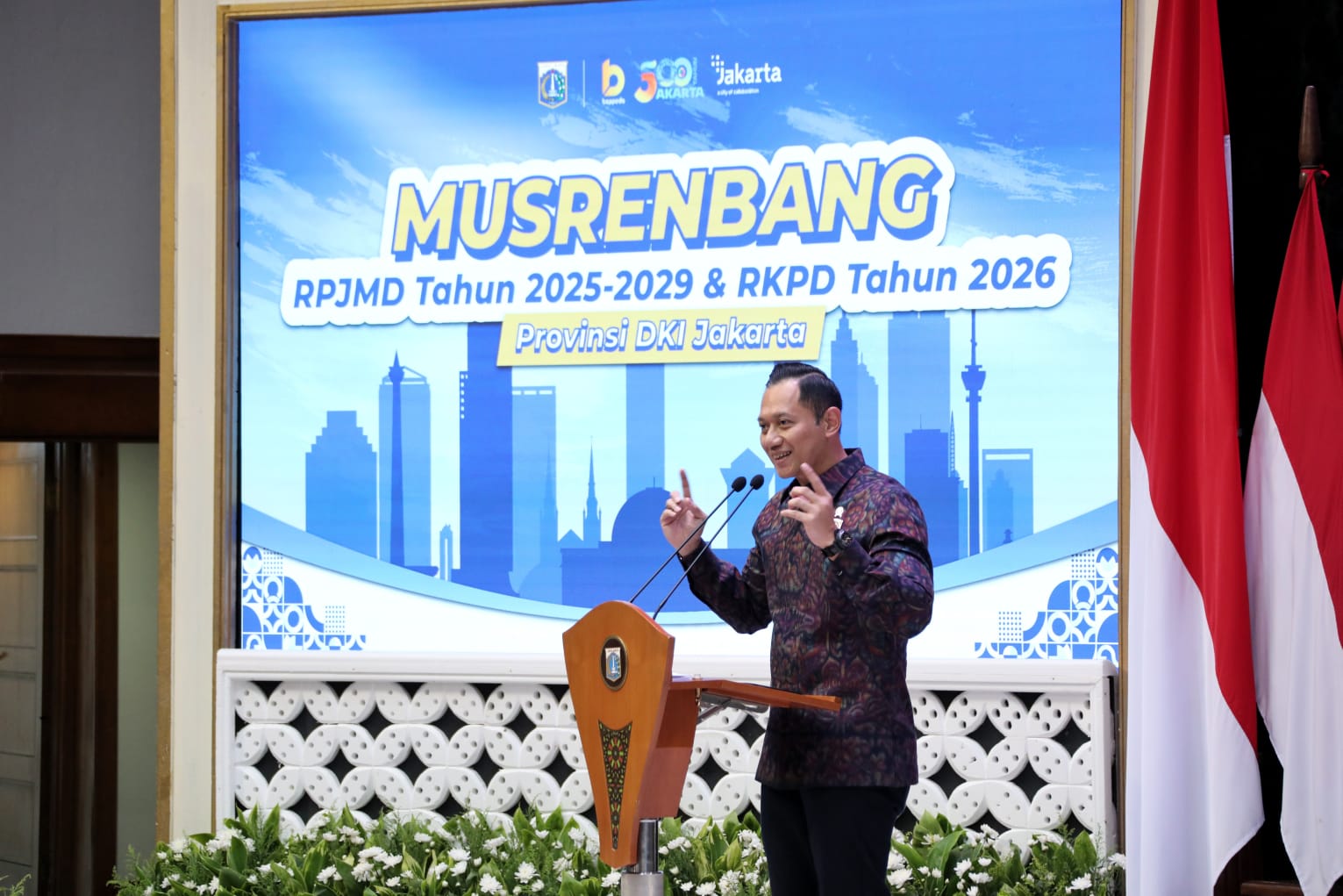 Dalam sambutannya pada acara Musrenbang Provinsi DKI Jakarta pada Rabu (23/4/2025), Menteri Koordinator Bidang Infrastruktur dan Pembangunan Kewilayahan, Agus Harimurti Yudhoyono (AHY), menyampaikan bahwa Jakarta sebagai kota yang akan memasuki usia lima abad harus mampu menjawab berbagai tantangan dengan visi yang berkelanjutan, inklusif, dan berdaya saing global dengan mewujudkan visi-misi Presiden Prabowo Subianto melalui lima agenda prioritas.